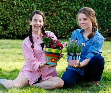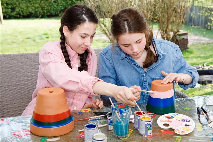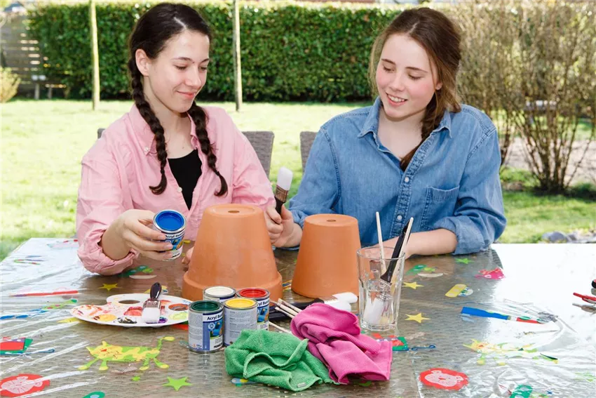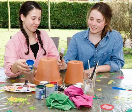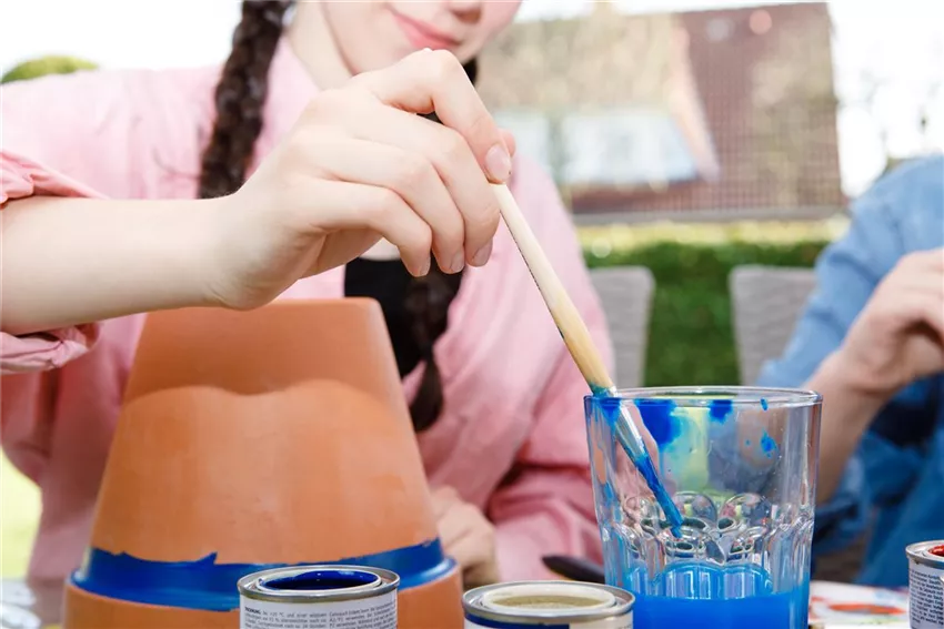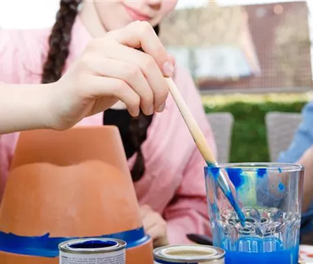 Wenn der Blumentopf richtig trocken ist, könnt ihr mit dem Bemalen beginnen. Soll der Topf eine andere Farbe bekommen, dann müsst ihr mit der Farbe eurer Wahl mehrere Schichten aufmalen. Damit ihr nicht so lange warten müsst, bis die Farbe getrocknet ist, nehmt euch einen Föhn zur Hilfe.