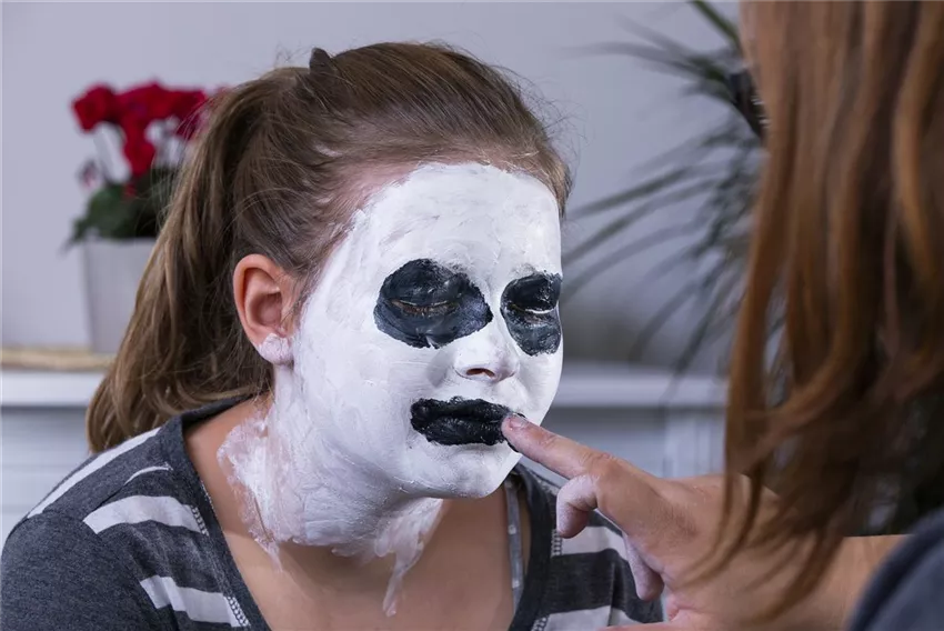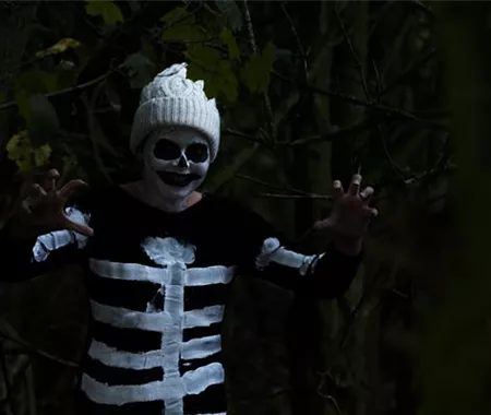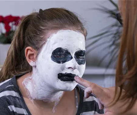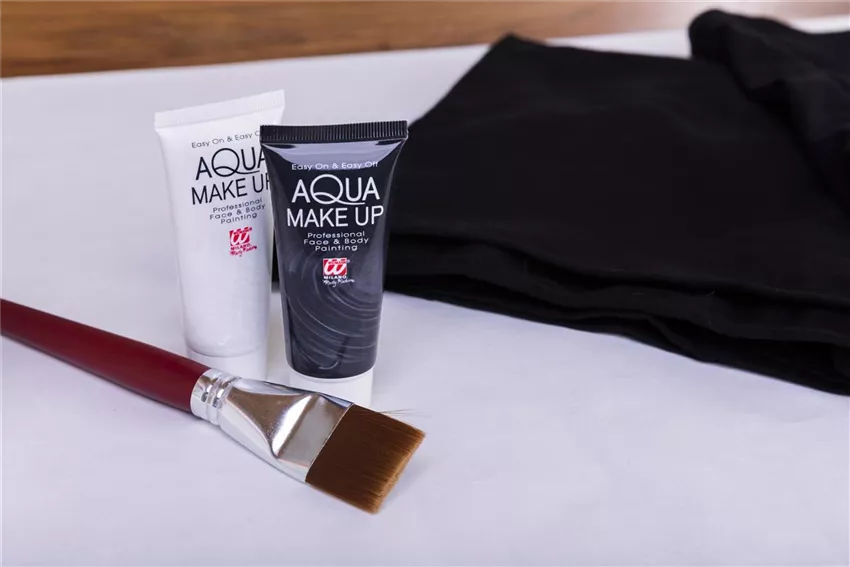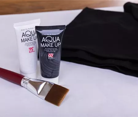 Um euren Freunden den perfekten Halloween-Schrecken einzujagen, könnt ihr auch euer Gesicht mit Theaterschminke bemalen. Grundiert dabei das komplettes Gesicht mit weißer Schminke. Zeichnet mit der schwarzen Schminke große Kreise um eure Augen und füllt sie ebenfalls schwarz aus. Auf die Nase zeichnet ihr ein spitz nach oben zulaufendes Dreieck. Und über eure Lippen zeichnet ihr den groben Grundriss eines Gebisses.