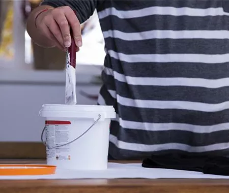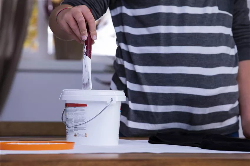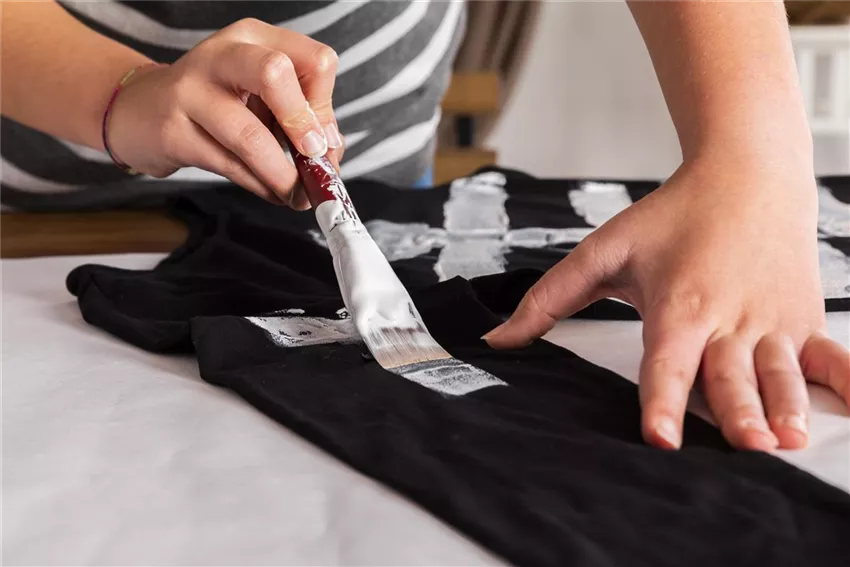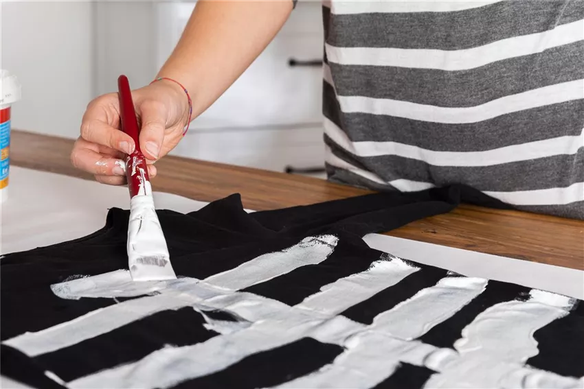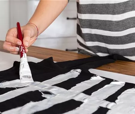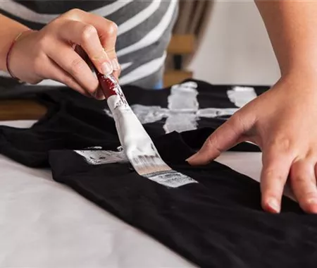 Breitet das schwarze T-Shirt mit der Vorderseite nach oben auf einer glatten Oberfläche aus. Sorgt dafür, dass ihr genügend Platz habt. Damit die Farbe nicht ungewollt auf den Tisch komm, legt ihr am besten ein Stück Pappe zwischen den Stoff und die Oberfläche des Tisches. Und dann kommt die weiße Farbe zum Einsatz.