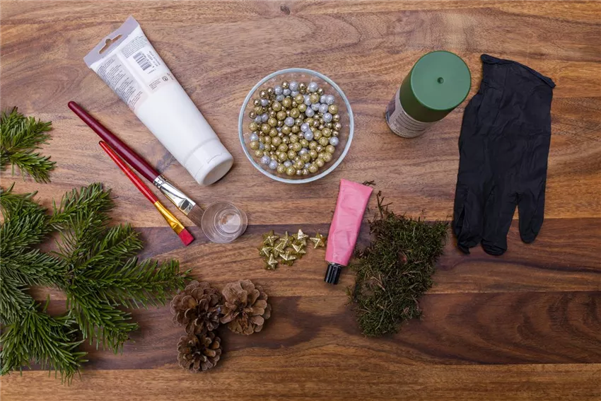 Wenn die Tannenzapfen komplett getrocknet sind, fangt ihr an, die Perlen auf die Zapfenenden zu kleben. Das geht am besten mit Sekundenkleber oder Heißkleber. Aber passt auf die Finger auf und nehmt nur eine kleine Menge Kleber. Die kleinen Perlen halten auch mit wenig Kleber.