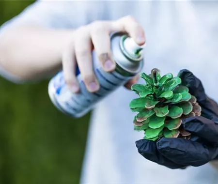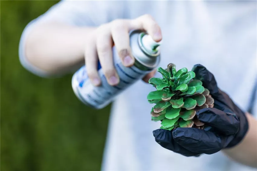 Los geht’s mit dem Besprühen der Tannenzapfen. Macht das am besten an der frischen Luft und legt eine Zeitung drunter, damit ihr den Boden nicht vollsprüht. Anschließend lasst ihr die Farbe gut trocknen.