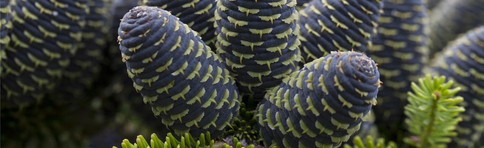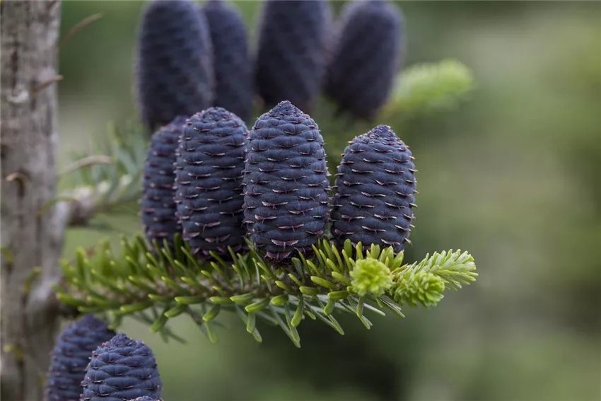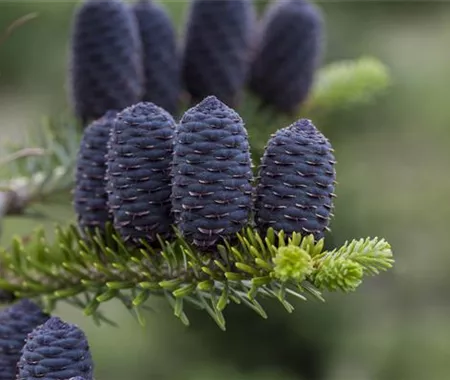 Bei den Blüten der Koreatanne unterscheidet man in männliche und weibliche Blüten. Die männlichen Blüten sind eher unscheinbar und Gelb. Die männlichen Blüten findet ihr in der ganzen Baumkrone und das meist an den oberen Nadeln. Von Mai bis Juni zeigt die Koreatanne dann ihre weiblichen Blüten. Die sind lila und sitzen aufrecht an den Zweigen. Die weiblichen Blüten sind die späteren Zapfen, für die die Koreatanne bekannt ist. Die können bis zu 7 Zentimeter lang und 3 Zentimeter dick werden. In den Zapfen sind die Samen der Koreatanne enthalten.