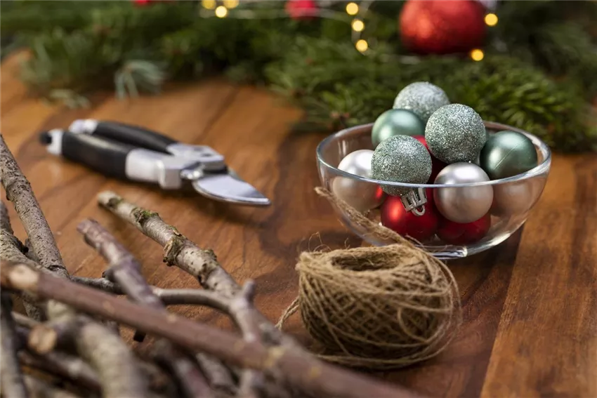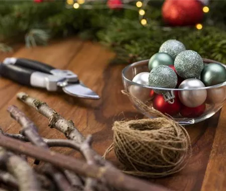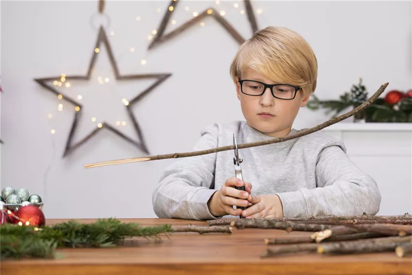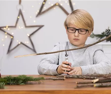 Schneidet die Stöcker mit einer Gartenschere auf die richtige Größe. Fangt mit dem größten Stock an, der entscheidet dann, wie breit euer Weihnachtsbaum wird. Je mehr Stöcker ihr schneidet, desto größer wird euer Weihnachtsbaum.