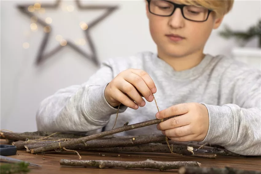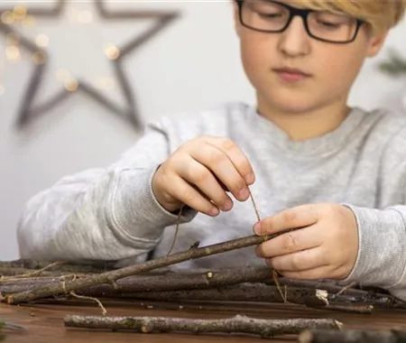 Legt euch die Stöcker der Größe nach auf den Tisch, sodass ihr euren Weihnachtsbaum schon erkennen könnt. Jetzt nehmt ihr das Paketband und knotet die Stöcker zusammen. Macht dafür einen Knoten an ein Ende des Stocks, wickelt das Band um den zweiten Stock, macht wieder einen Knoten und so weiter, bis ihr oben angekommen seid.