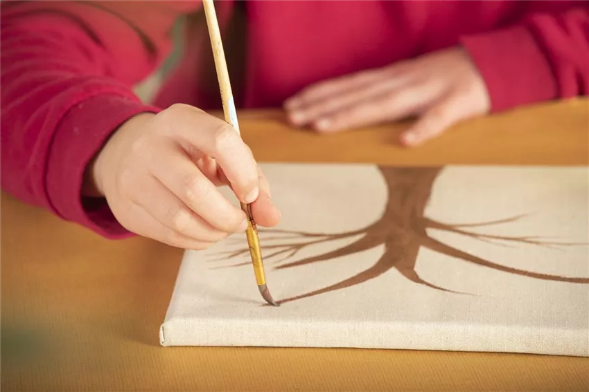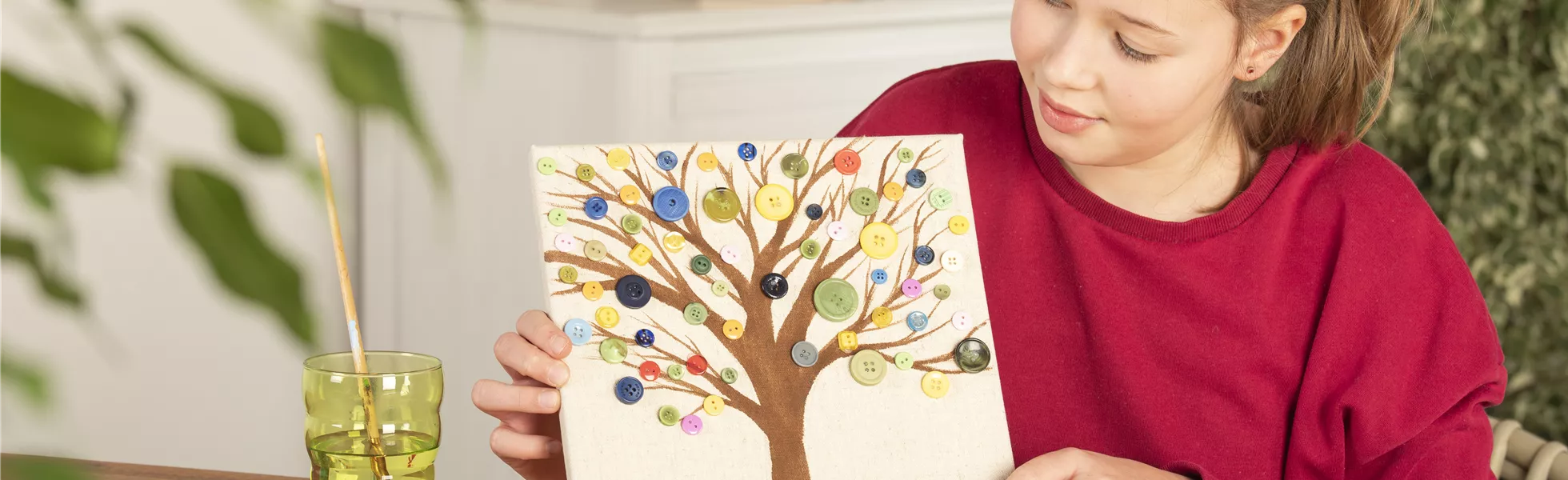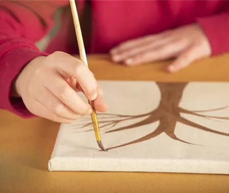 Schnappt euch den Pinsel und fangt an, auf die Leinwand einen Baum zu malen. Je mehr kleine Verästelungen ihr aufmalt, desto mehr Knöpfe könnt ihr später daran aufkleben.