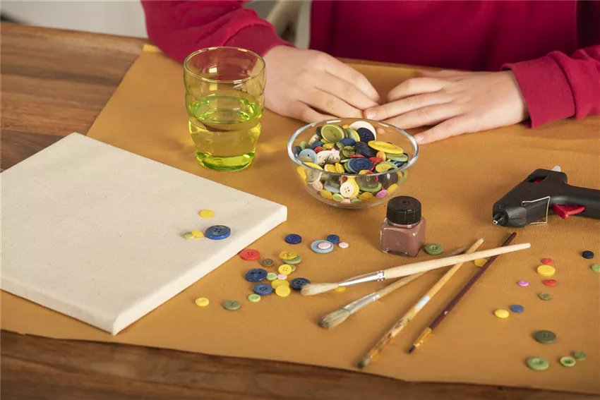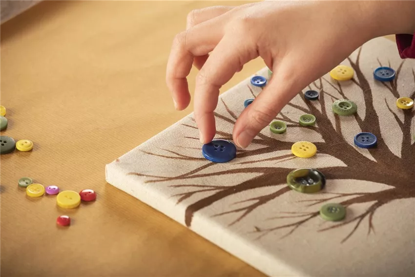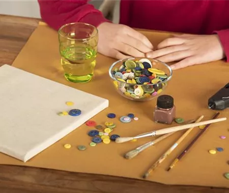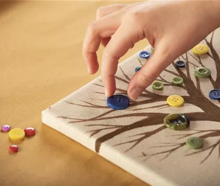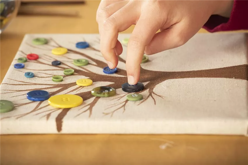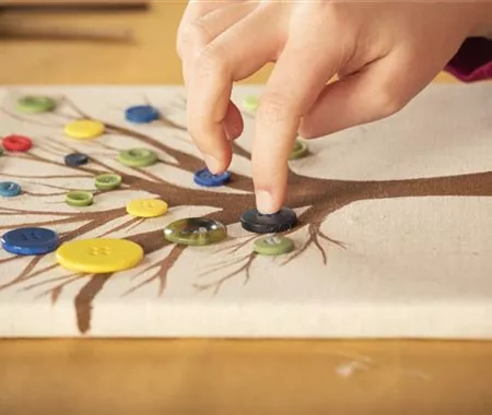 Klebt so viele bunte Knöpfe an die Äste, wie ihr wollt. Eurer Kreativität sind keine Grenzen gesetzt. Je bunter, desto besser!