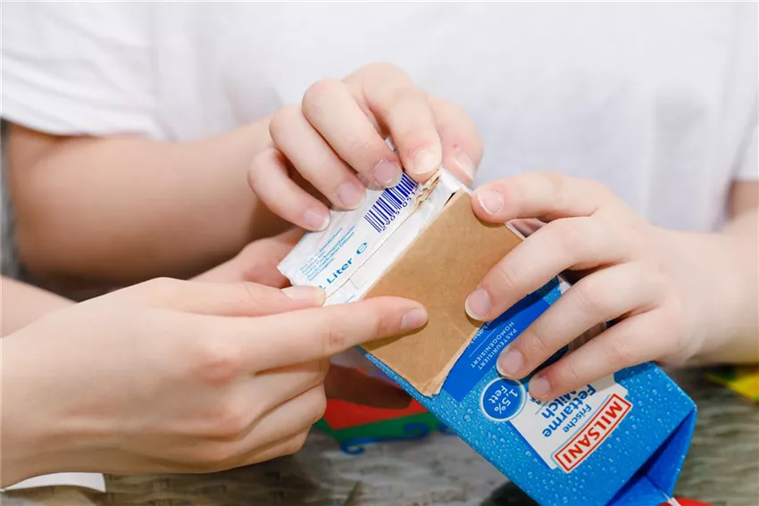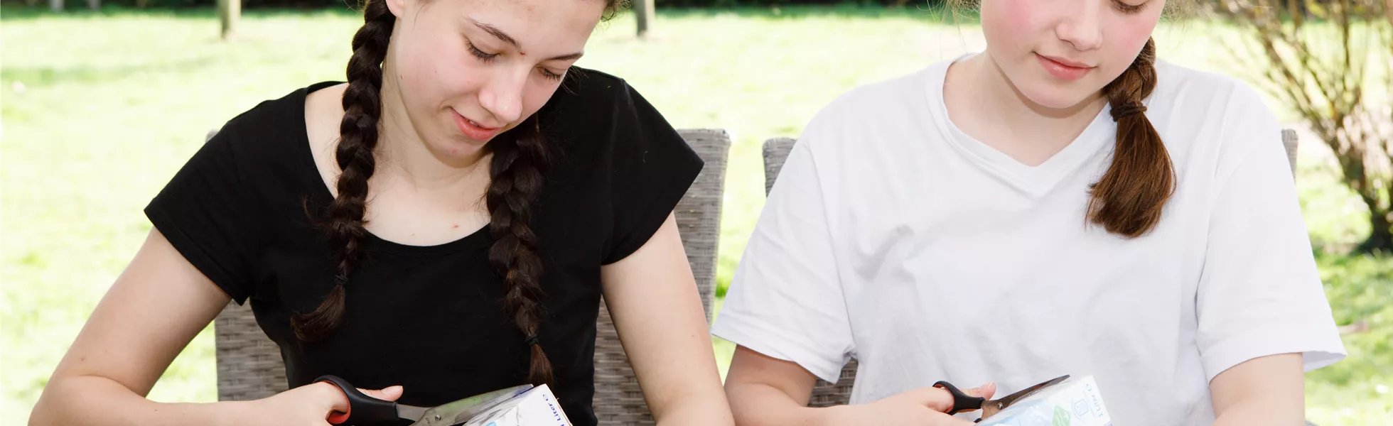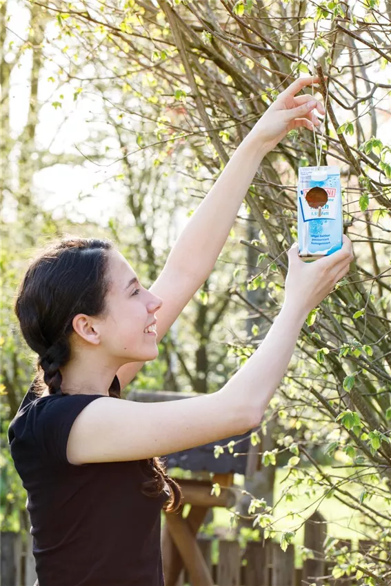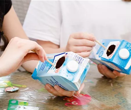 Steckt zwei aneinander liegende Seiten nach innen. Die beiden anderen Seiten werden als Boden unter die Milchtüte geknickt und mit doppelseitigem Klebeband aneinander befestigen. So hat die Tüte etwas an Länge verloren und den Vögeln fällt das Rein- und Rausfliegen leichter. Überstehendes einfach abschneiden.