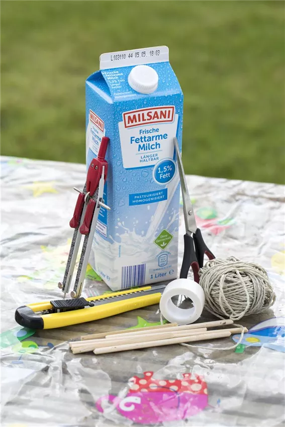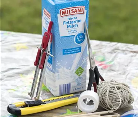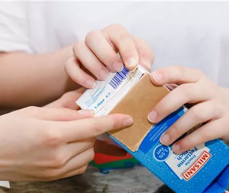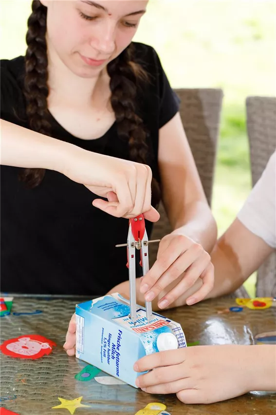 Zum Aufhängen müsst Ihr noch eine Kordel oder ein festes Band durch die obere Lasche der Milchtüte ziehen. Stecht hierfür wieder ein Loch durch die Pappe.