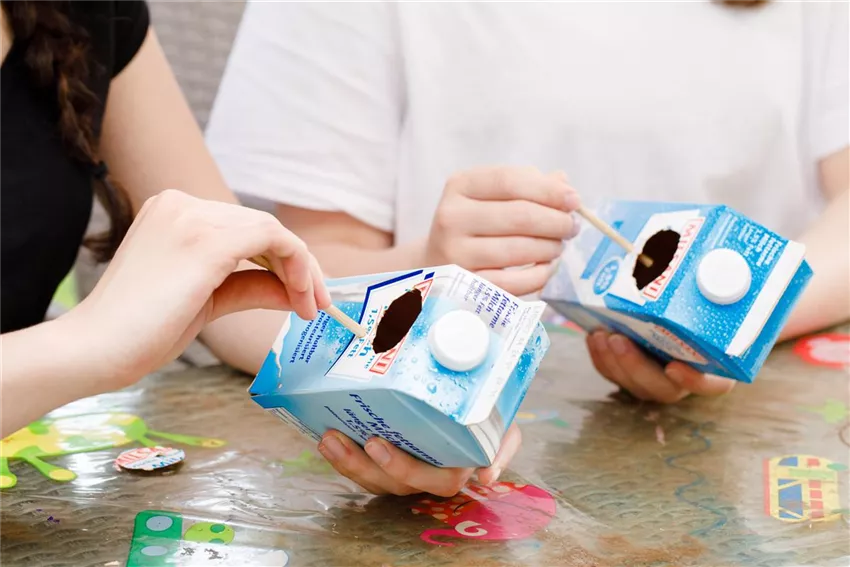 Jetzt fehlt nur noch die Sitzstange, die unterhalb des Lochs gesteckt wird. Stecht mit einem spitzen Gegenstand unterhalb des ausgeschnittenen Lochs die Milchtüte ein und drückt das Holzstäbchen hinein. Lasst euch dabei von einem Erwachsenen helfen. Das Loch darf nicht größer sein als das Stäbchen, sonst steckt es nicht richtig fest.