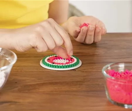 Für die Wassermelone steckt ihr den äußeren Kreis eurer Schablone mit grünen Perlen. Dann kommt ein Kreis mit weißen Perlen. Das Innere des Kreises füllt ihr dann mit roten Perlen und steckt zwischendurch schwarze Perlen. Das sind die Kerne der Wassermelone.