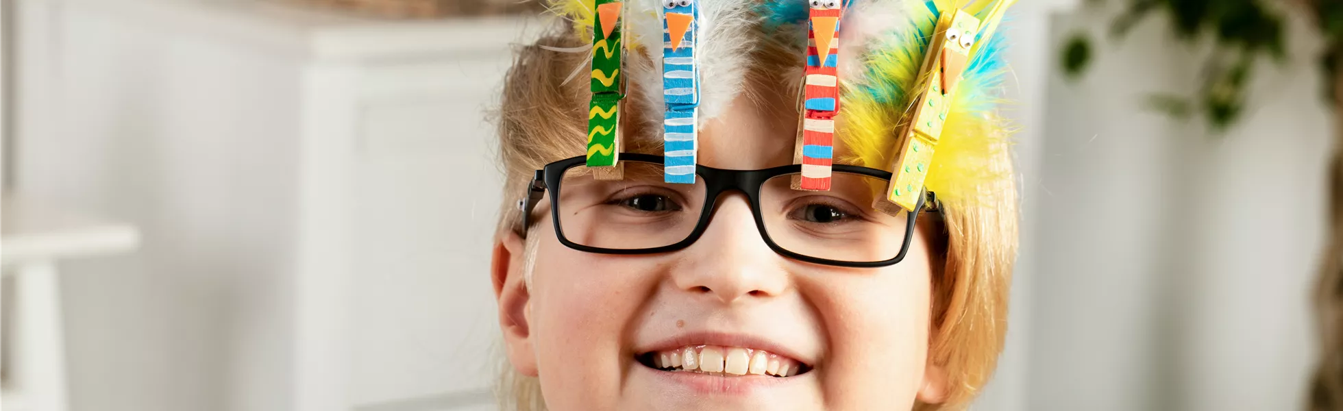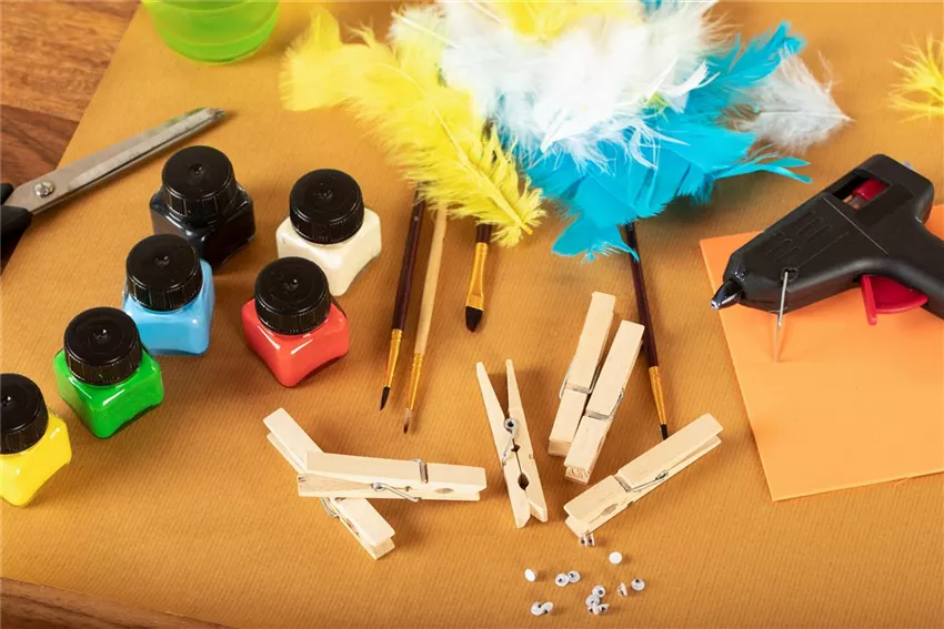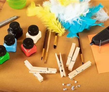 Damit jetzt noch coole Paradiesvögel aus den Klammern werden, könnt ihr viele bunte Federn mit Heißkleber auf der Rückseite der Wäscheklammern festkleben. Passt dabei aber auf eure Finger auf und verbrennt euch nicht!