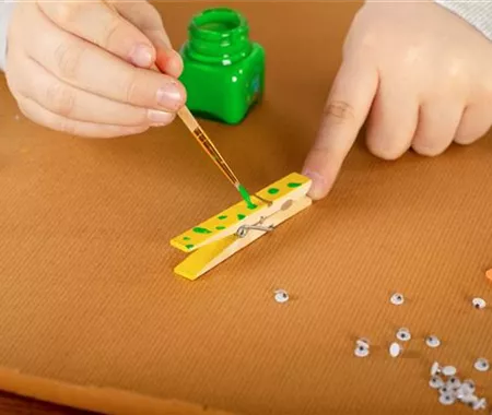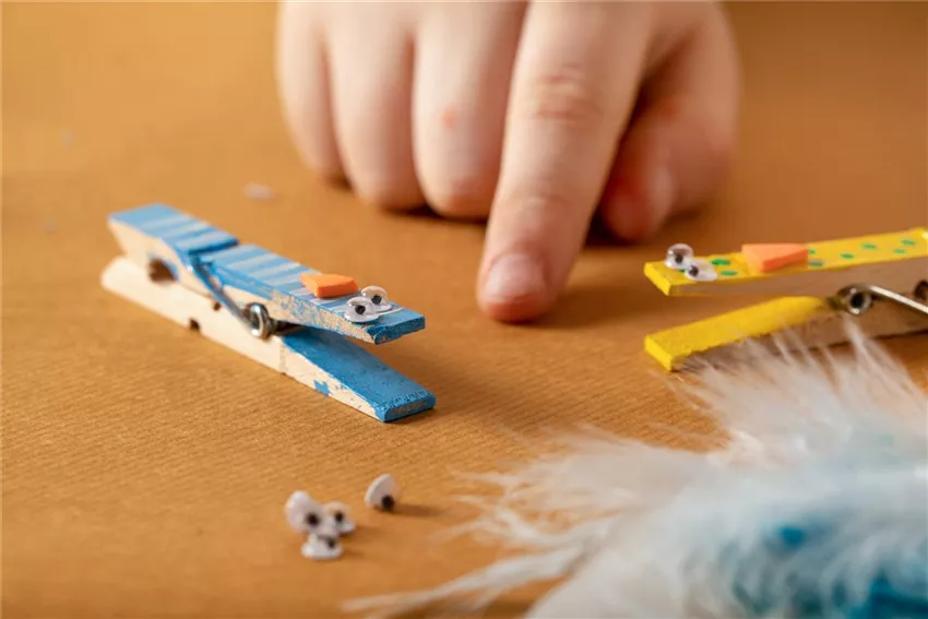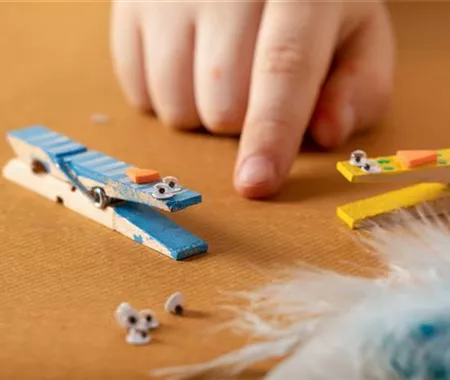 Wenn die Acrylfarben getrocknet sind, könnt ihr die Wackelaugen und die Schnäbel mit Kleber auf den Wäscheklammern befestigen.