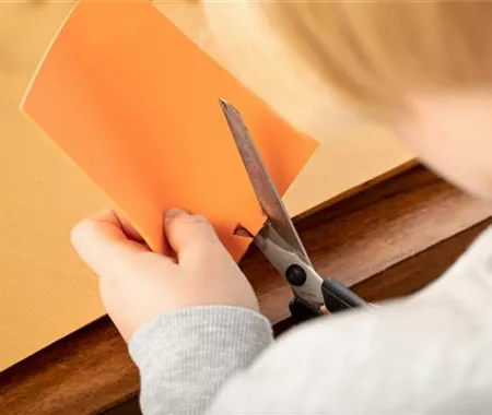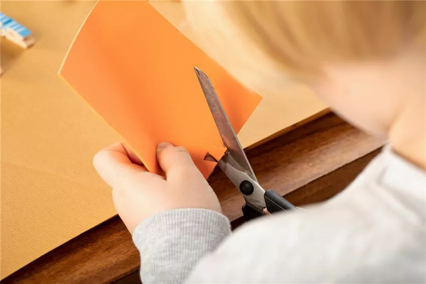 Aus dem orangenen Moosgummi könnt ihr jetzt kleine Schnäbel ausschneiden. Dafür schneidet ihr mit einer Schere einfach kleine Dreiecke aus dem Moosgummi, die an einer Seite kürzer sind, damit ein kleiner Schnabel entsteht.