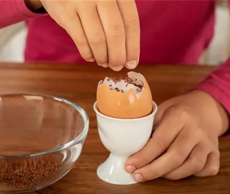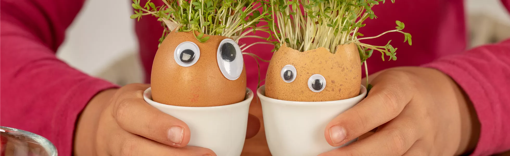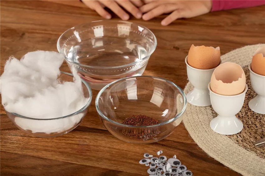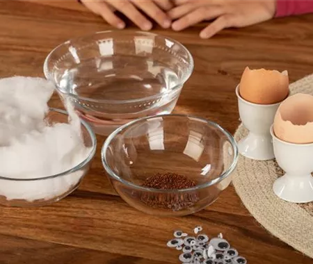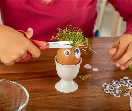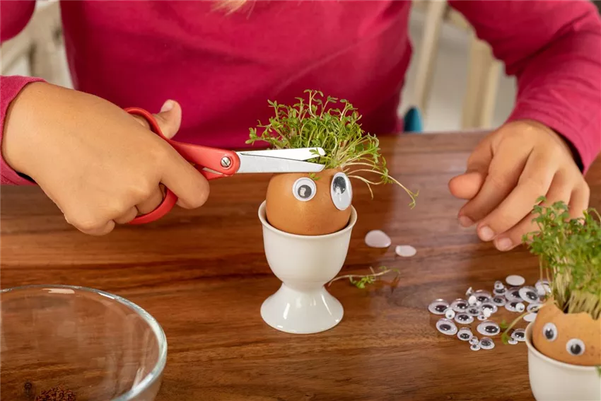 In nur wenigen Stunden fangen die Samen an zu quellen und schon nach einer Woche könnt ihr die Kresse ernten. Klebt ein paar Wackelaugen auf die Eierschalen und schneidet den kleinen Kerlchen coole Frisuren.