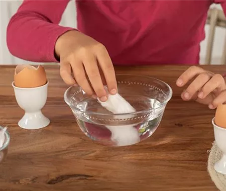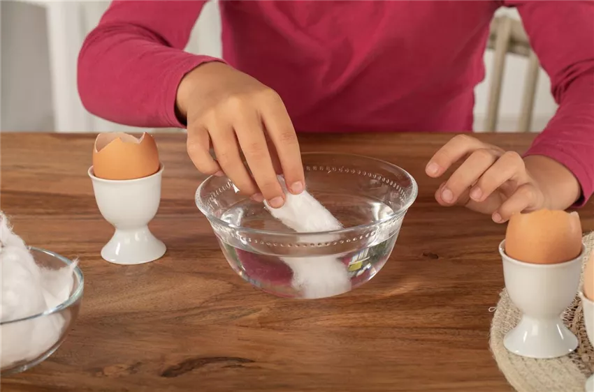 Stellt die Eierschalen in die Eierbecher und nehmt euch die Watte zur Hand. Die tränkt ihr vorher ordentlich in Wasser. Sie muss sich komplett mit Wasser voll saugen und landet dann in den Eierschalen.