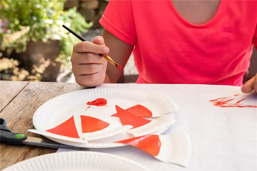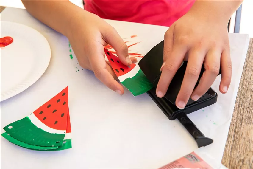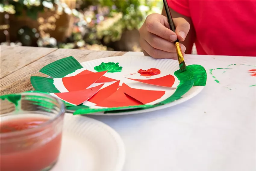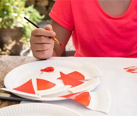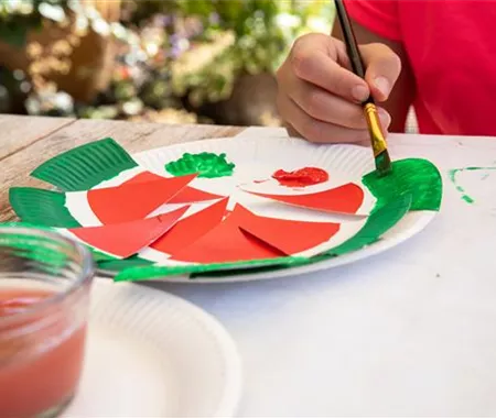 Schneidet zuerst eure Pappteller in die richtig Form. Melonen schneidet man ja immer in Dreiecke. Das macht ihr auch mit den Papptellern. Erst schneidet ihr den Pappteller in der Mitte durch. Die Hälfte schneidet ihr dann noch mal in der Mitte durch. Und dann könnt ihr euch überlegen, ob euch die Stücke so reichen, oder ihr sie noch kleiner haben wollt.