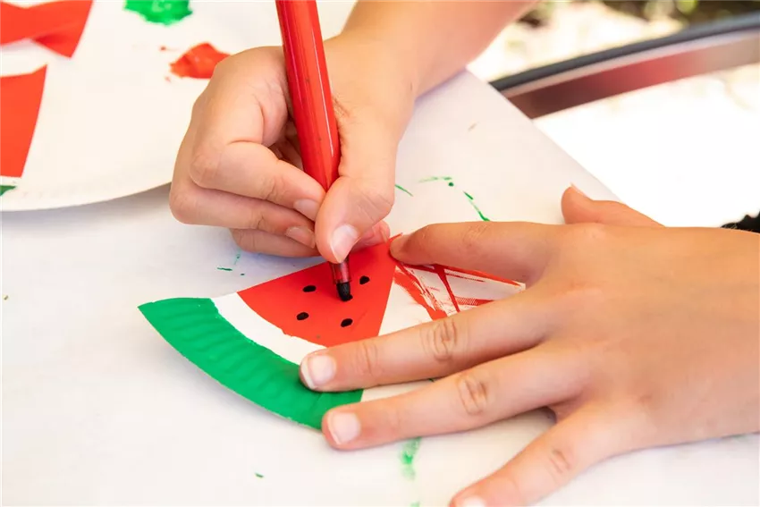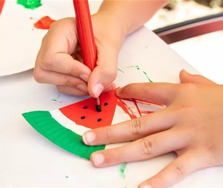 Wenn alles getrocknet ist, könnt ihr mit einem schwarzen Filzstift noch Kerne in die rote Fläche malen. Jetzt sehen die Stücke wirklich aus wie Melonenstücke, oder?