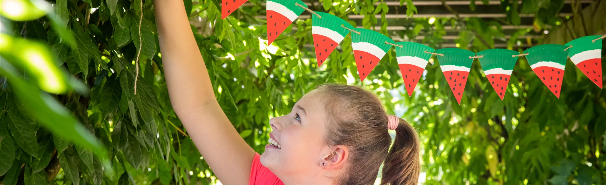 Damit eure Gartenparty im Sommer noch sommerlicher wird, könnt ihr bunte Girlanden aufhängen. Aber nicht einfach irgendwelche Girlanden. Nein! Bastelt euch eine Girlande mit Melonenstücken!