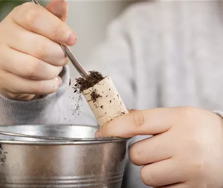 Und jetzt seid ihr auch wieder dran. Mit einem Teelöffel befüllt ihr die Löcher im Korken bis zur Hälfte mit Blumenerde. Drückt sie gut an, sollte das Ende des Teelöffels zu groß sein, könnt ihr auch einen Bleistift dafür nutzen.
