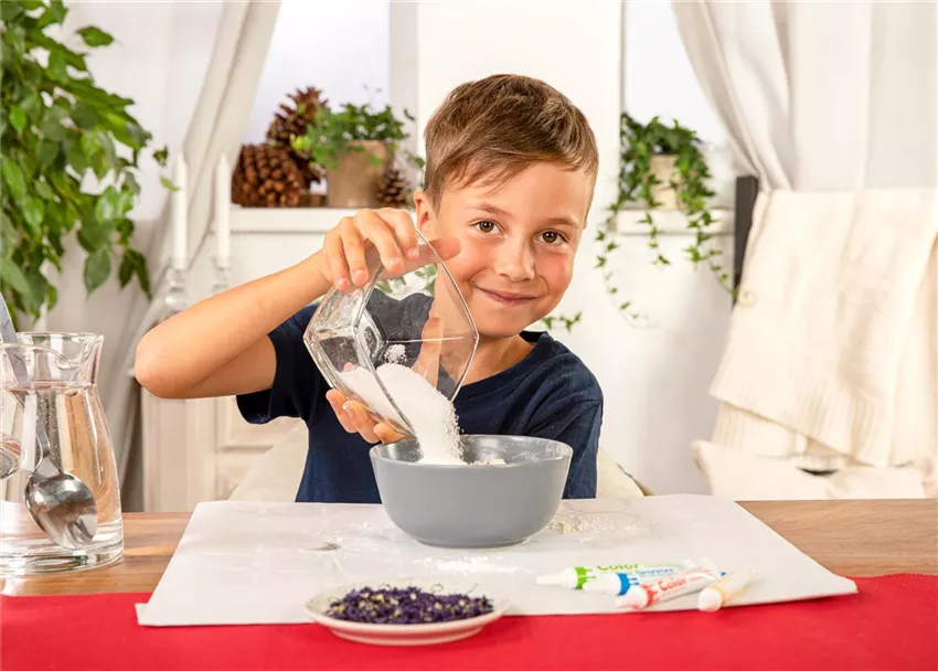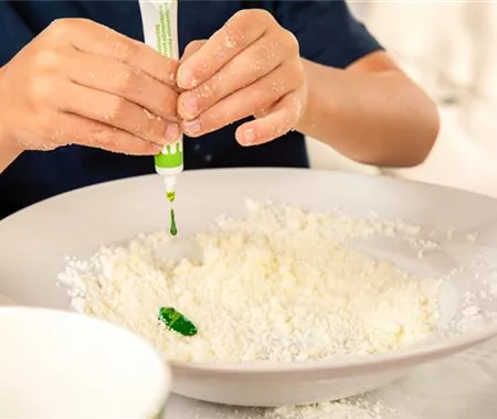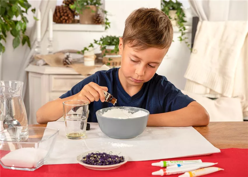 Gebt dann das Olivenöl, das Duftöl und das Wasser dazu und vermengt alles zu einem Teig.