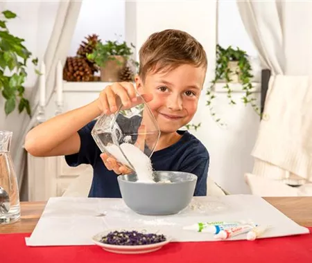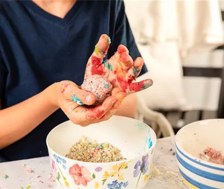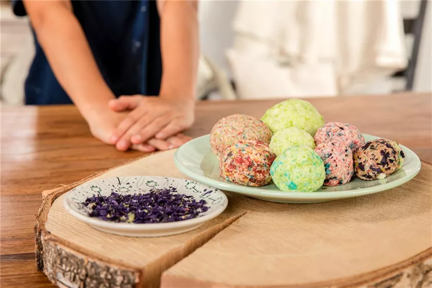 Eure Badebomben könnt ihr jetzt mit der Hand formen. Gebt ein bisschen Deko dazu, wie zum Beispiel getrocknete Blüten oder Kräuter. Eurer Kreativität ist dabei keine Grenze gesetzt.