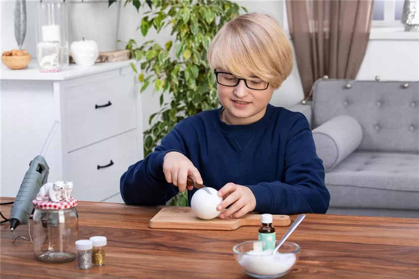 Schneidet eure Styroporkugel in der Mitte durch. Die bildet später den Schneehügel, auf dem eure Figuren stehen. Klebt die Halbkugel mit Heißkleber im Deckel des Weckglases fest.