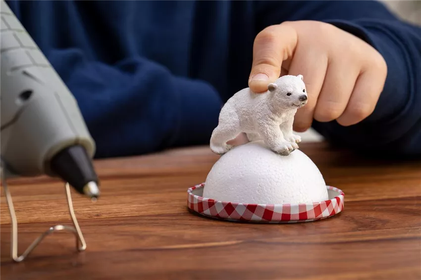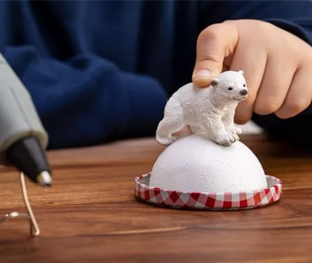Jetzt könnt ihr mit dem Heißkleber eure Figuren auf den Schneehügel kleben. Lasst eurer Fantasie beim Dekorieren des Schneehügels freien Lauf.