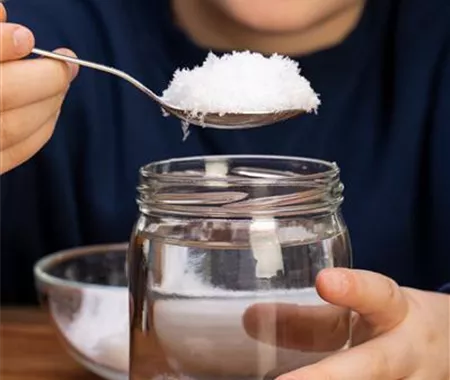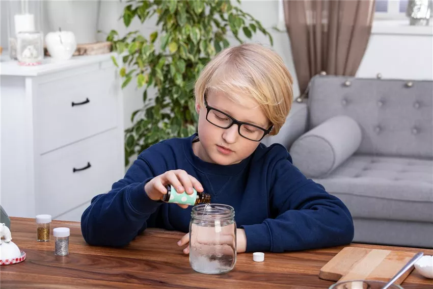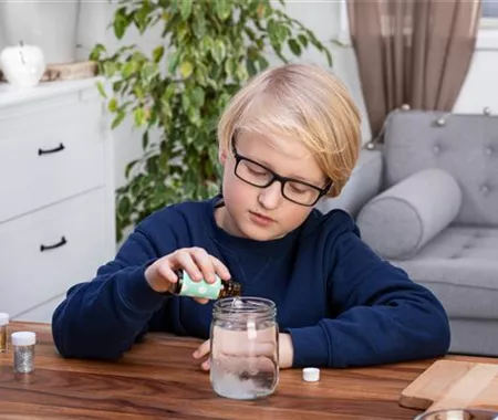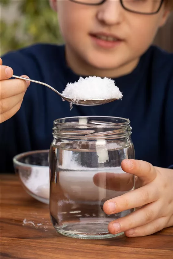Während der Kleber trocknet (ca. 20 Minuten) könnt ihr euer Weckglas randvoll mit destilliertem Wasser füllen. Mit normalem Wasser würden sich nach einiger Zeit Algen bilden. In das Wasser kommt noch ein Spritzer Glycerin. Das lässt die Schneeflocken schön langsam sinken.