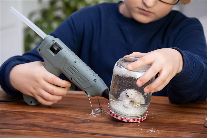 Setzt den Deckel gaaaaanz langsam und vorsichtig auf das Glas. Glitzer und Schnee dürfen nämlich nicht in das Gewinde des Glases kommen, weil eure Schneekugel sonst undicht wird. Sollte euer Glas trotzdem Wasser verlieren, könnt ihr es von außen auch noch mit Heißkleber verkleben. Fertig ist eure Schneekugel!