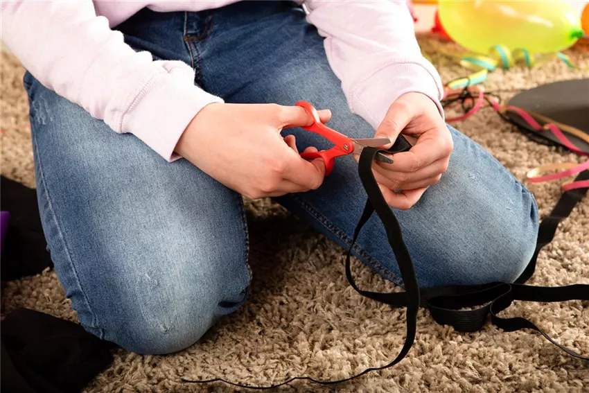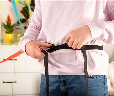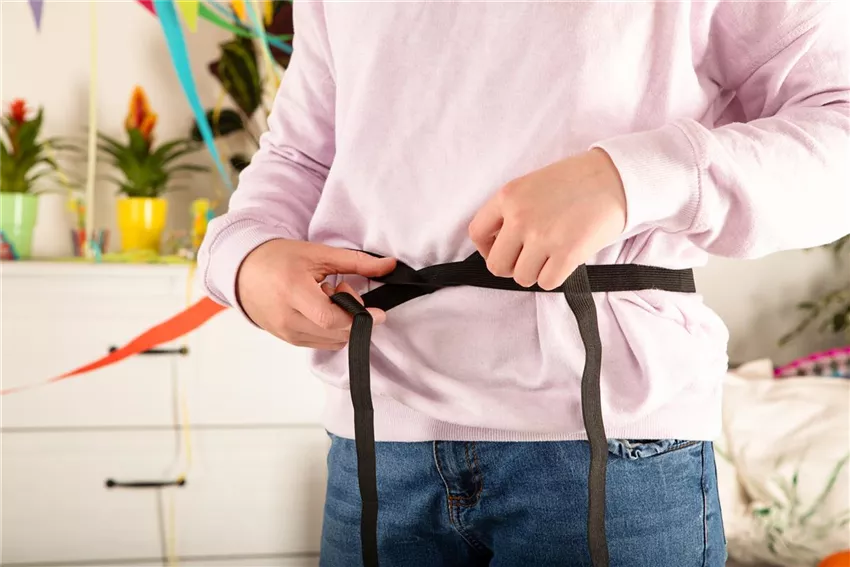 Nehmt euch das Einziehgummi und legt es euch um die Taille, um zu messen, wie lang das Band sein muss. Lasst ein bisschen mehr Platz, ihr müsst ja noch einen Knoten in das Band machen.