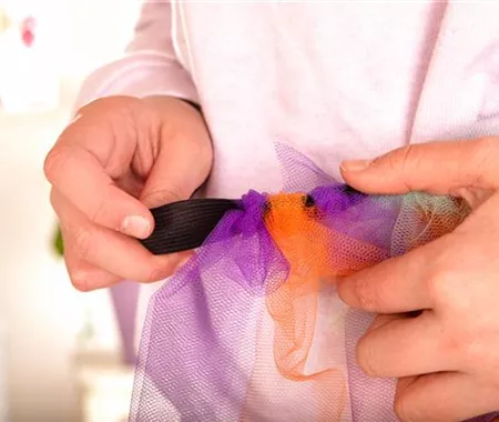Schneidet das benötigte Stück vom Einziehgummi ab und knotet es zusammen. Und dann geht’s auch schon an den Tüll. Je mehr, desto besser!
