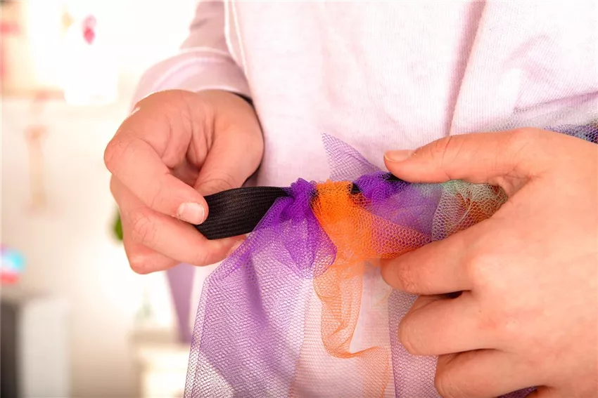 Schneidet euch von dem Tüll immer etwa 30 Zentimeter lange Steifen ab, die ihr dann an dem Einziehgummi festknotet. Das macht ihr so lange, bis ihr einen bauschigen schönen Rock bekommt. Je mehr Farben und lagen, desto bunter und bauschiger wird der Rock.