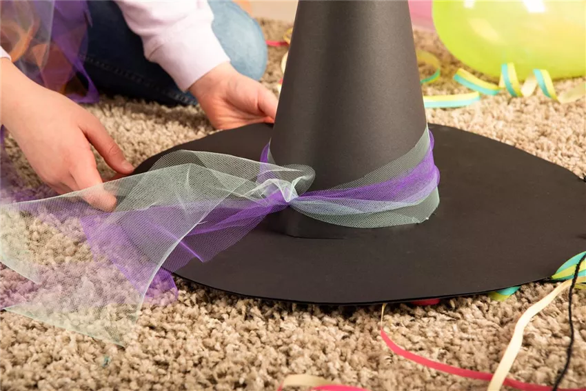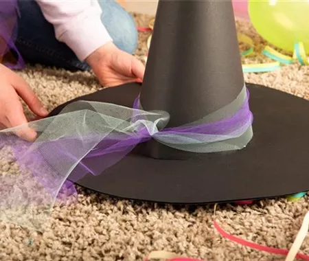 Um euren Hexenhut zu verschönern, nehmt ihr euch auch wieder Tüll und wickelt ihn am Schirm um den Hut. Schneidet so weit hinten ab, dass ihr genug Platz für einen Knoten habt und auch noch Tüll auf der anderen Seite übrig bleibt.