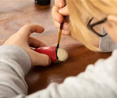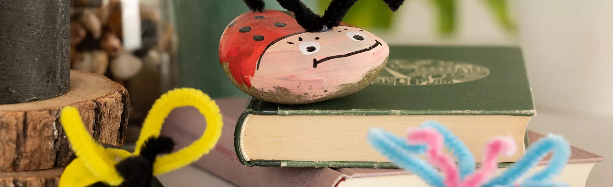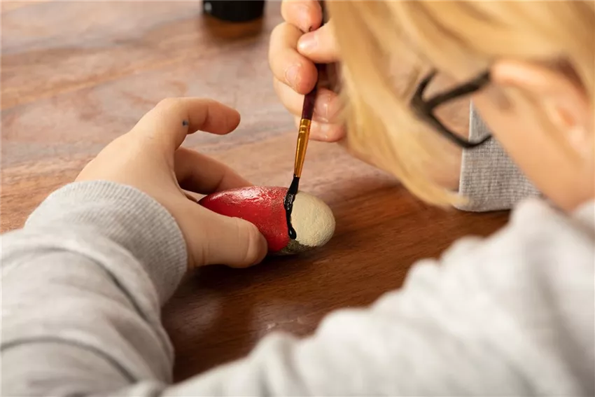 Für einen Marienkäfer malt ihr einen Halbkreis knapp oberhalb der Mitte auf den Stein. Den kleinen Teil malt ihr hautfarben an, den größeren Teil knallrot. Wenn die Farbe getrocknet ist, könnt ihr mit einem schwarzen Filzstift Augen und Mund, sowie die Punkte auf dem Rücken aufmalen. Aus schwarzen Pfeifenputzern könnt ihr dann noch Fühler biegen und mit Heißkleber aufkleben.