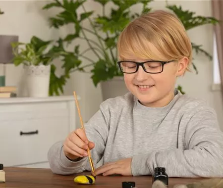 Wie wäre es mit einer Biene? Malt dazu den Stein abwechseln mit gelben und schwarzen Streifen an. Lasst vorne wieder einen kleinen Halbkreis für den Kopf frei und malt den gelb an. Darauf könnt ihr dann, wenn alles getrocknet ist, wieder Augen und Mund aufmalen. Mit einem gelben Pfeifenputzer könnt ihr kleine Flügen biegen und diese mit Heißkleber auf den Rücken der Biene kleben.
