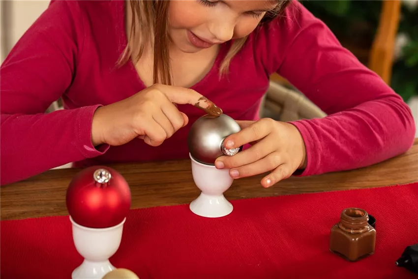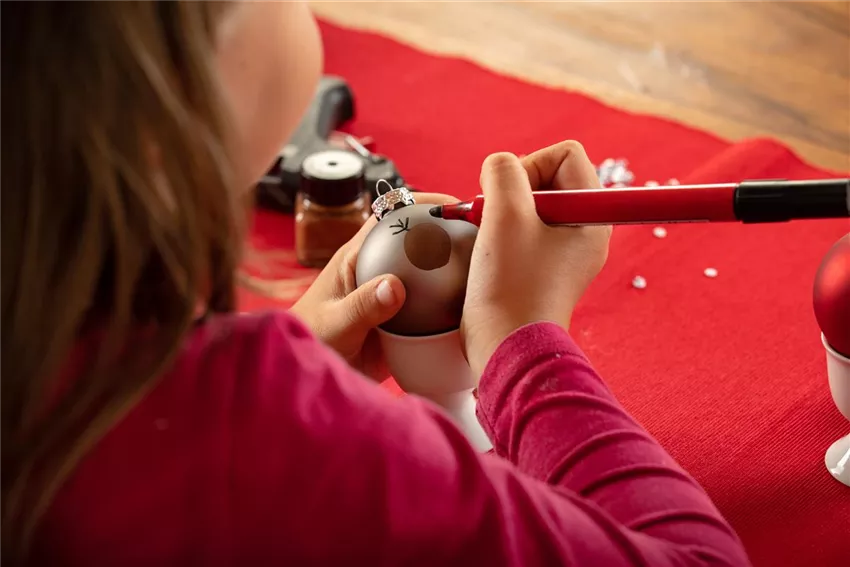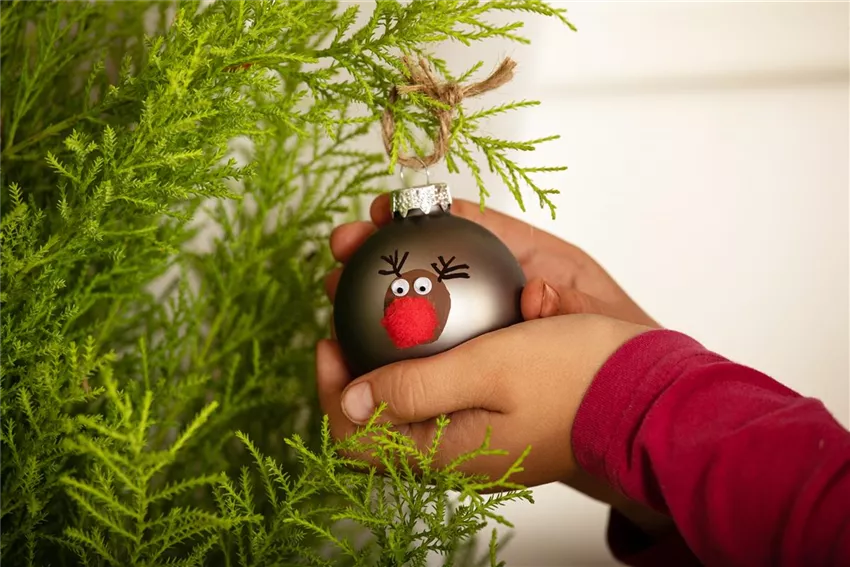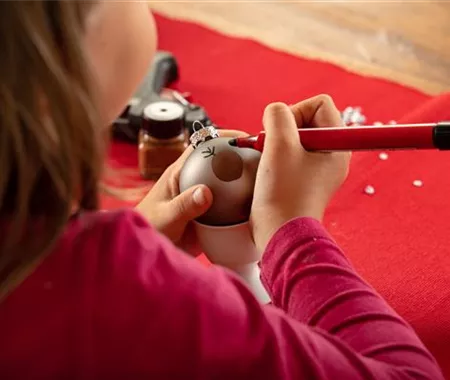 Schnappt euch die alten Christbaumkugeln und die Acrylfarbe. Damit legt ihr los. Malt einen eurer Finger mit der braunen Farbe an und drückt ihn auf die Kugel. Damit eure Rentiere nicht zu klein werden, nehmt ihr am besten euren Daumen. Ihr könnt entweder einen Abdruck auf eine Kugel machen oder auch mehrere.