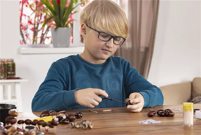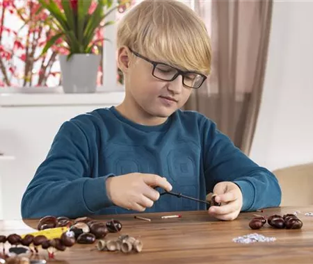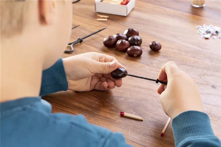 Überlegt euch, welche Kastanie ihr als Kopf und als Hinterteil nehmen wollt. In diese Kastanien werden nämlich andere Löcher gebohrt, als in die Kastanien für den Körper.