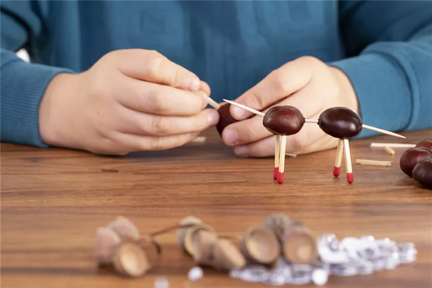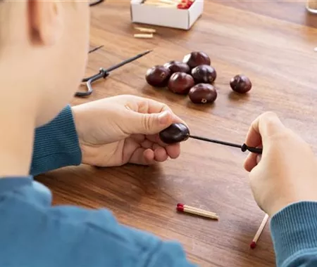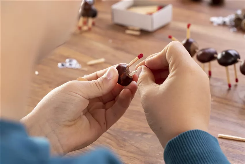 Jetzt könnt ihr in jeweils eins der Löcher einen abgebrochenen Zahnstocher stecken. Achtet dabei darauf, dass der Zahnstocher lang genug ist, um immer zwei Kastanien miteinander zu verbinden.