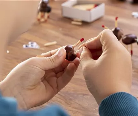 In die Unterseite der Kastanien bohrt ihr nun jeweils zwei Löcher nebeneinander, in die ihr dann kurz abgebrochene Streichhölzer als Füße hinein stecken könnt. Auch in die Kastanie für das Hinterteil steckt ihr kleine Füßchen.